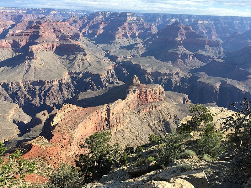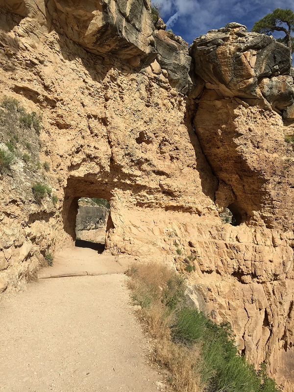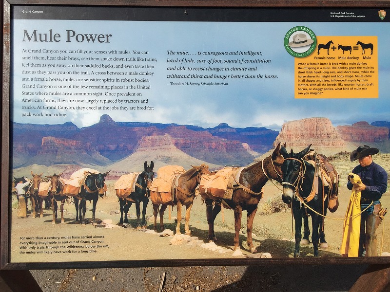 グランドキャニオンはコロラド高原にできた断崖(深さ1800m,幅29km,長さ446km)で地球の浸食状況が納得できる景色です。対岸まで2日間のトラッキングツアーがあるようです。谷底まで行けるトレッキングにはドンキも通行し来て楽しかった。