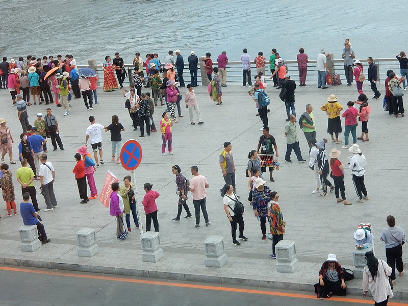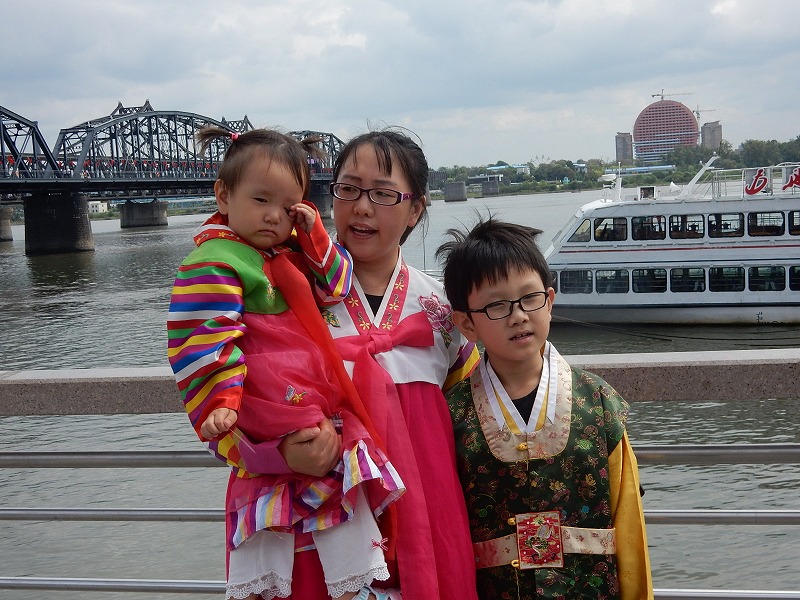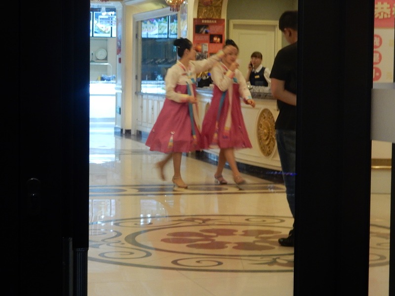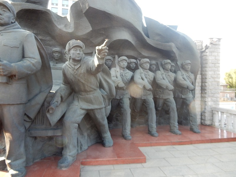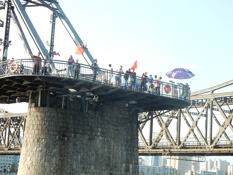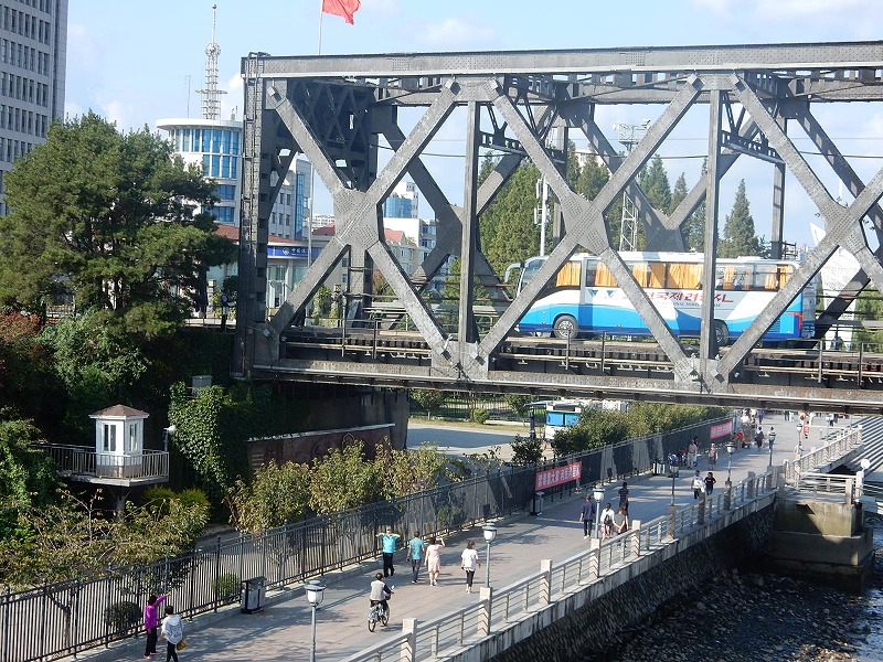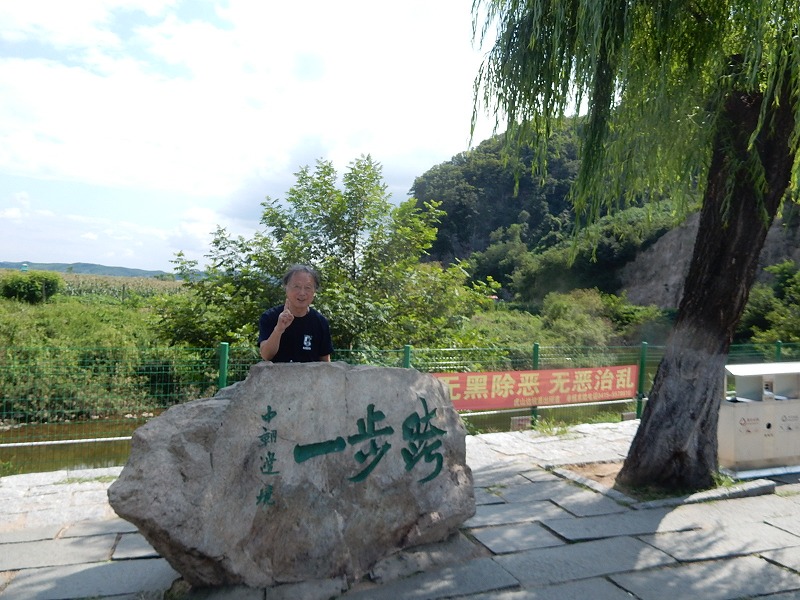 今朝も瀋陽5:30起床し散歩しました。ホテル近くは何もありません。9:07発の高速鉄道で1時間40分で中朝国境の丹東に着きます。丹東駅前には毛沢東の大きな銅像があり北朝鮮との窓口の街を感じました。北朝鮮国境のスポット一歩跨は一歩で超えられる距離です。近くの万里の長城東端の虎山長城では往復1時間かけて見晴場所まで登りました。ここの万里の頂上は整備されていますが急な階段で苦労しました。観光のメインは中国と北朝鮮の国境の鴨緑江に架かる断橋の見学です。橋の袂ではチョゴリの貸衣装で記念撮影しています。多く中国人は北朝鮮に関心があるようです。その後、川幅の中心を30分で回る鴨緑江クルーズ船に乗り北朝鮮の人影をウオッチしました。夕食は北朝鮮経営の朝鮮料理店で食事しました。美人の北朝鮮の女性が食事サービスと歌のサービスでおもてなしされましたが撮影禁止で美人の要旨はお伝えできません。米大統領トランプも食べた冷麺は美味しかったです。