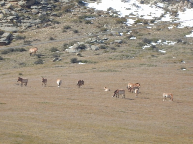 モンゴル唯一の鉄道でウランバートル駅から2つ目のエメトール駅(何にもない駅)まで45分の体験乗車をしました。事前に購入した切符には名前とパスポート番号まで記入されてびっくり。下車駅からバスでボスタイ国立公園に行きました。この公園には野生馬タヒ(モンゴルで絶滅、ヨーロッパの動物園で保護された馬をこの地に戻した)タヒを探し回るツアーです。荒地を走れる車に乗り換え探索開始。ツアーガイド同志が情報交換し探してくれました。夕食は羊の石焼ホルホグは形が分かる原型の皮付、コラーゲンが多く見ただけで満足。食用にカットし少し食べて終了。夜は地元の天文学者の先生が説明する星空観察会、満月と寒さのため先生の説明は上の空。今夜は待望のゲル宿泊です。テレビもスマホもない久しぶり長い夜です。日頃の睡眠不足が解消できました。