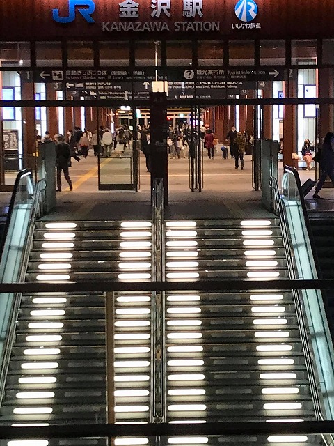 電車移動は波静かな日本海を右手にして新潟まで進み新幹線グリーンで高崎そして北陸新幹線もグリーンで金沢まで快適な旅です。金沢では駅前に木製で作られたゲートを見ました。芦原温泉まで北陸本線サンダーバードに乗車した長旅でした。