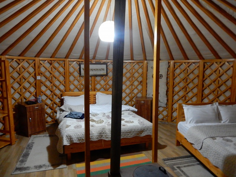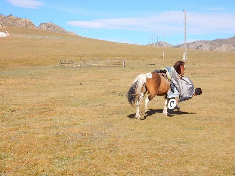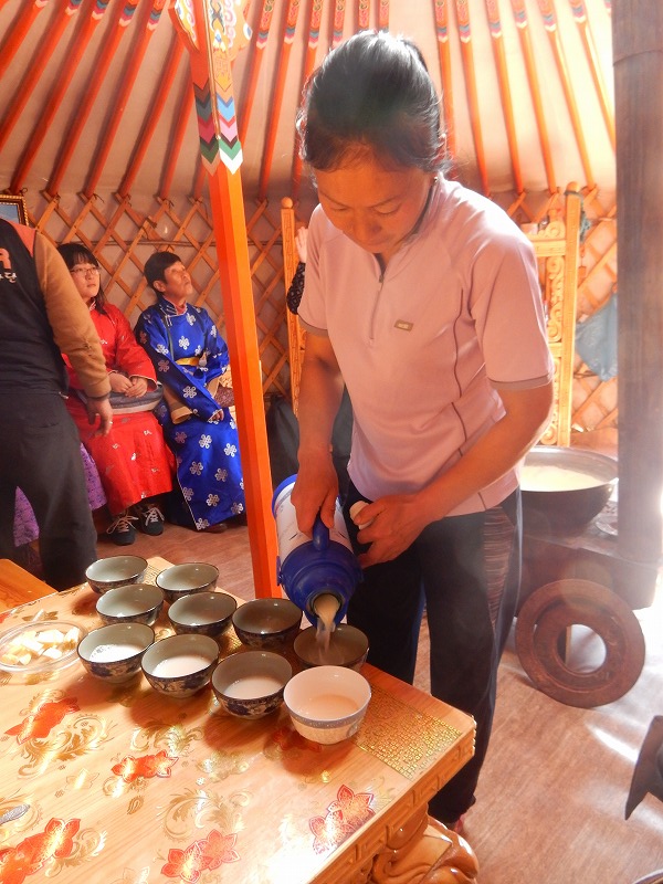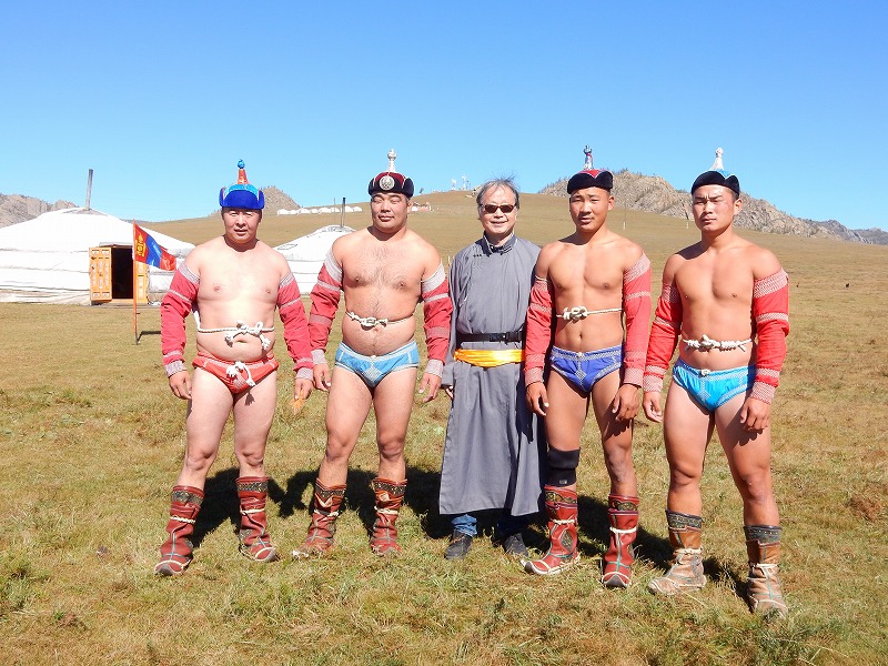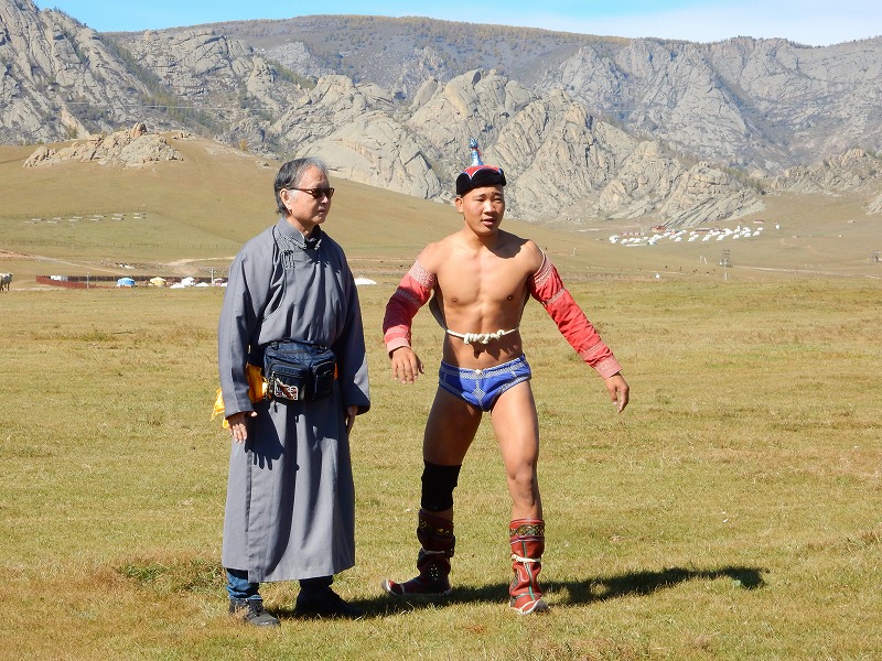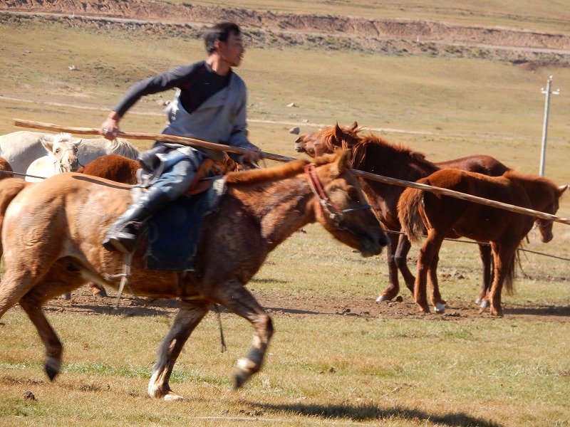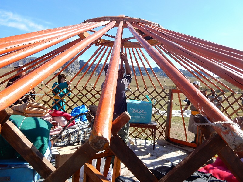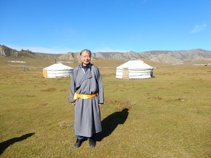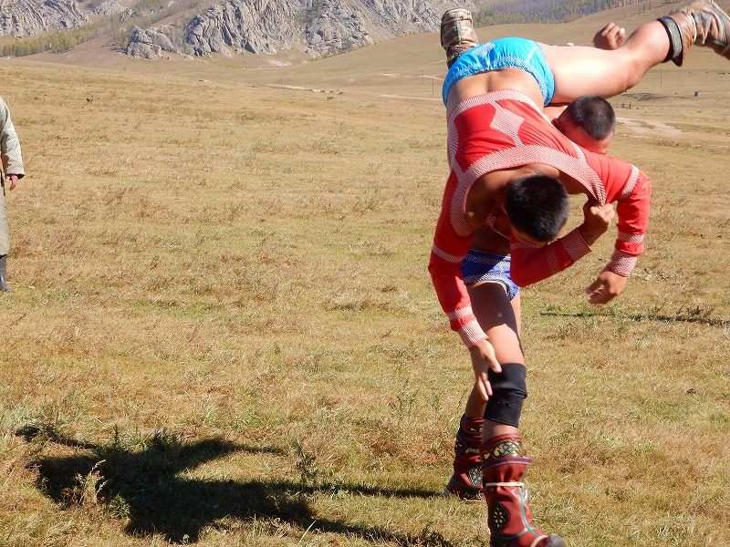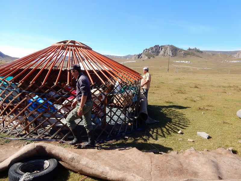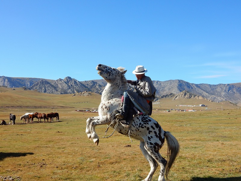 今日は宿泊地から30分ほど原野で放牧民との文化体験2日目。最初はゲル組み立てお手伝い?。モンゴル相撲観戦はウランバートルから現役の横綱と関脇(モンゴル相撲協会のメンバー)が来て実演。私はモンゴル衣装を着て協力、終了後ゲル内で親睦しました。昼は放牧民家族と羊肉たくさんの餃子作りを体験しました。乳しぼりは昼頃なので牛ではなく馬乳しぼりの見学になりました。(授乳仔馬を添わせ親馬を安心させての乳しぼりは2人係りの危険作業)。最後は遊牧民の曲乗りや2歳馬(乗馬未経験)を捕獲し人馴れ訓練ショーを楽しく鑑賞。最後は訓練された馬で乗馬体験をしました。宿泊地は昨日に続き停電です。夕食はローソクの基で皆さんと楽しく味わいました。『停電時の食事は会話が増え食材の食感が判り長い食事時間になりました』21時30分頃通電したので暖かいシャワーを浴びて就寝しました。