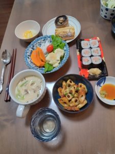 19:30なので二人で夕食の準備を始めた。あるものでいろいろ作っていたら、結構品数が増えた。美味そう!