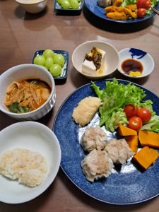 シャインマスカット以外は大してお金がかかっていない食材。でも、こうしてみると豪華だ。いただきます!!!